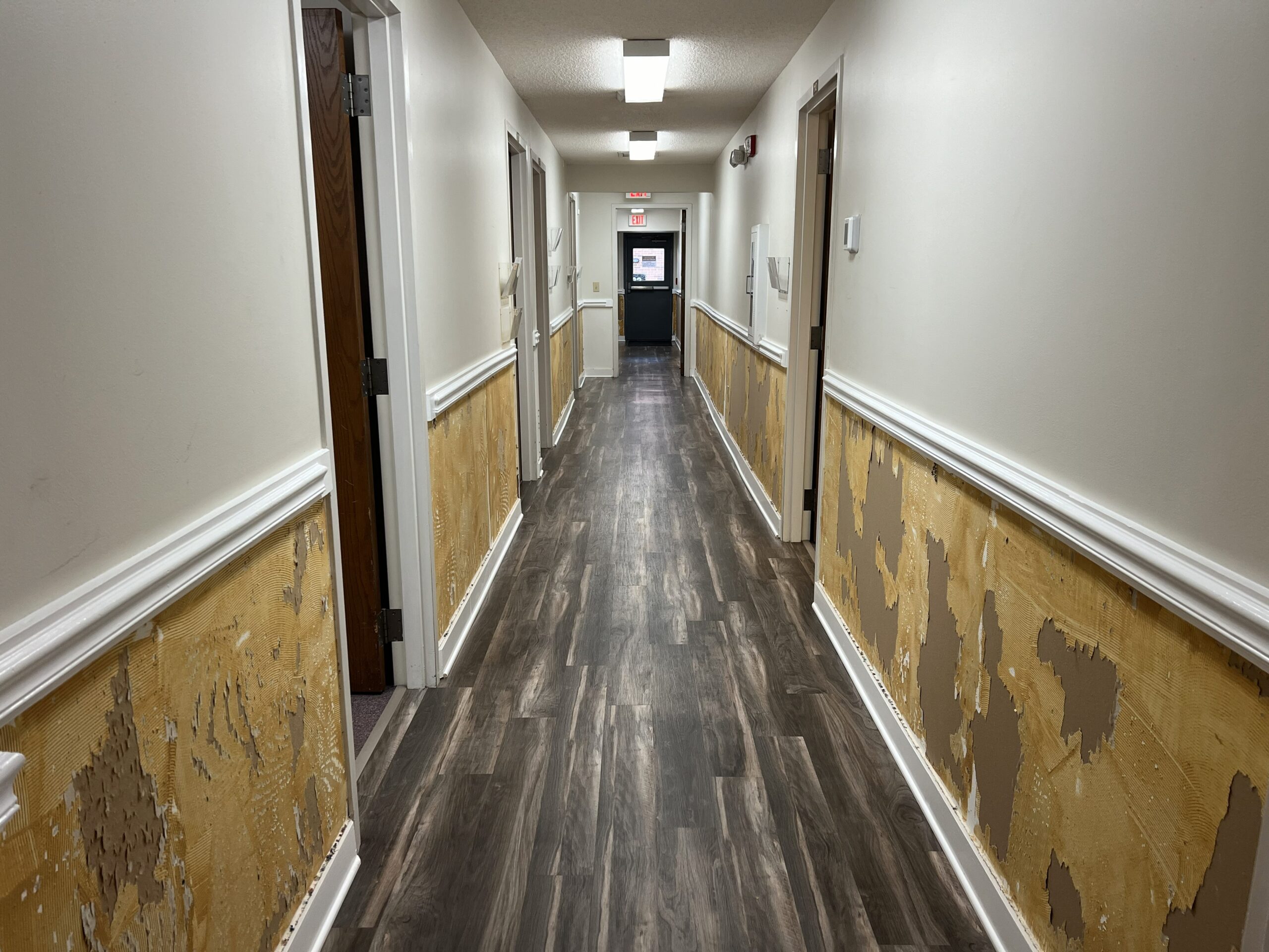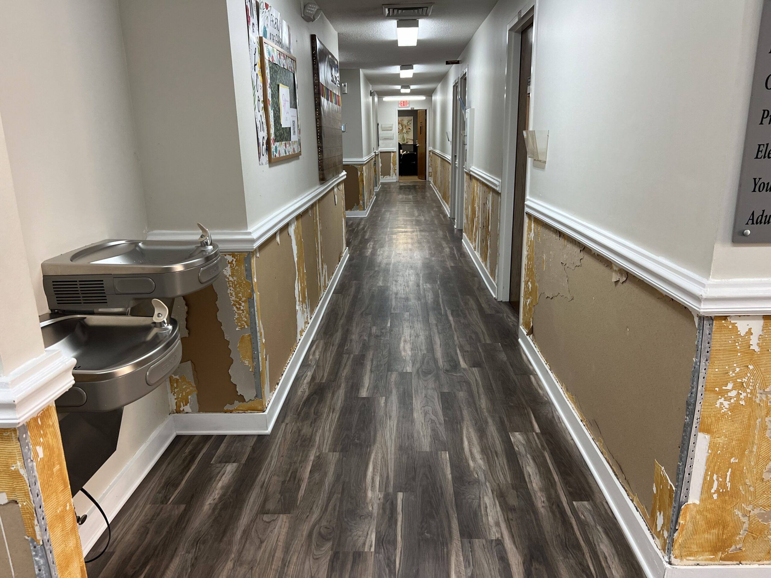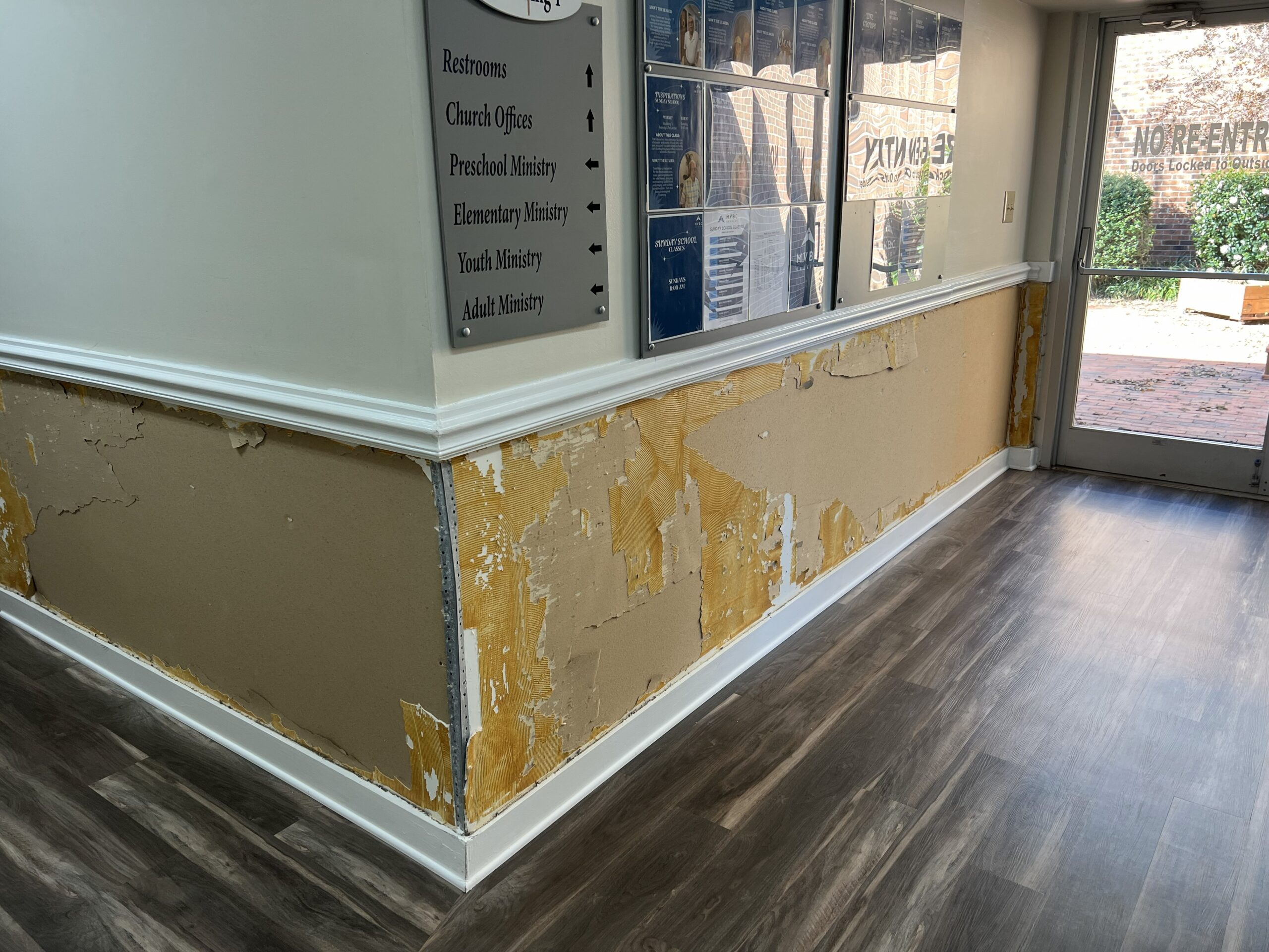 In a recent project at a church in Wake Forest, we were asked to remove wallpaper from the lower portion of the walls throughout the hallways and prepare the surfaces for paint. The walls were divided by chair rail molding, with wallpaper below and painted drywall above, finished with baseboard molding along the floor. The wallpaper had been in place for many years, so we took a careful, step-by-step approach to remove both the paper and the adhesive.