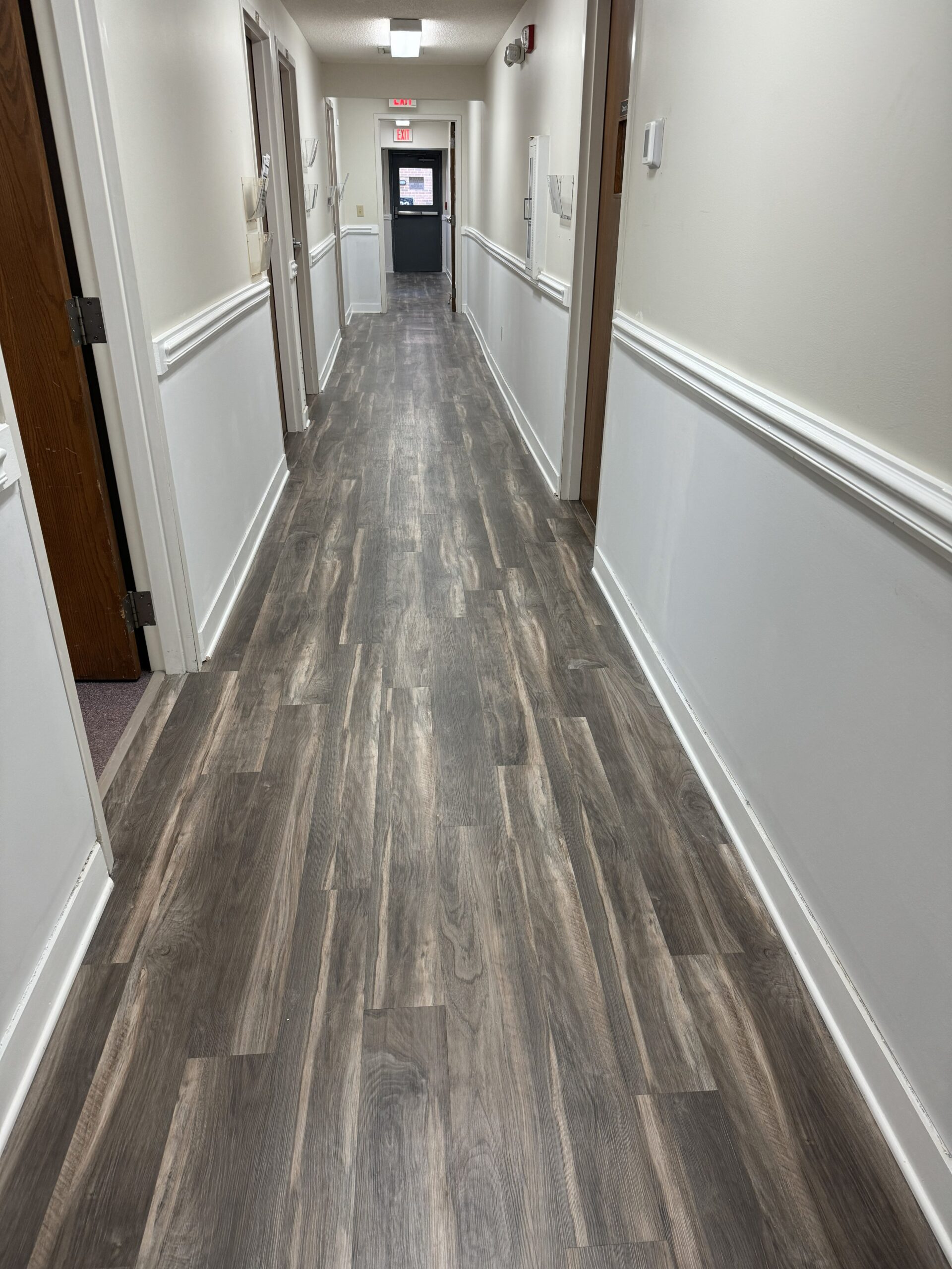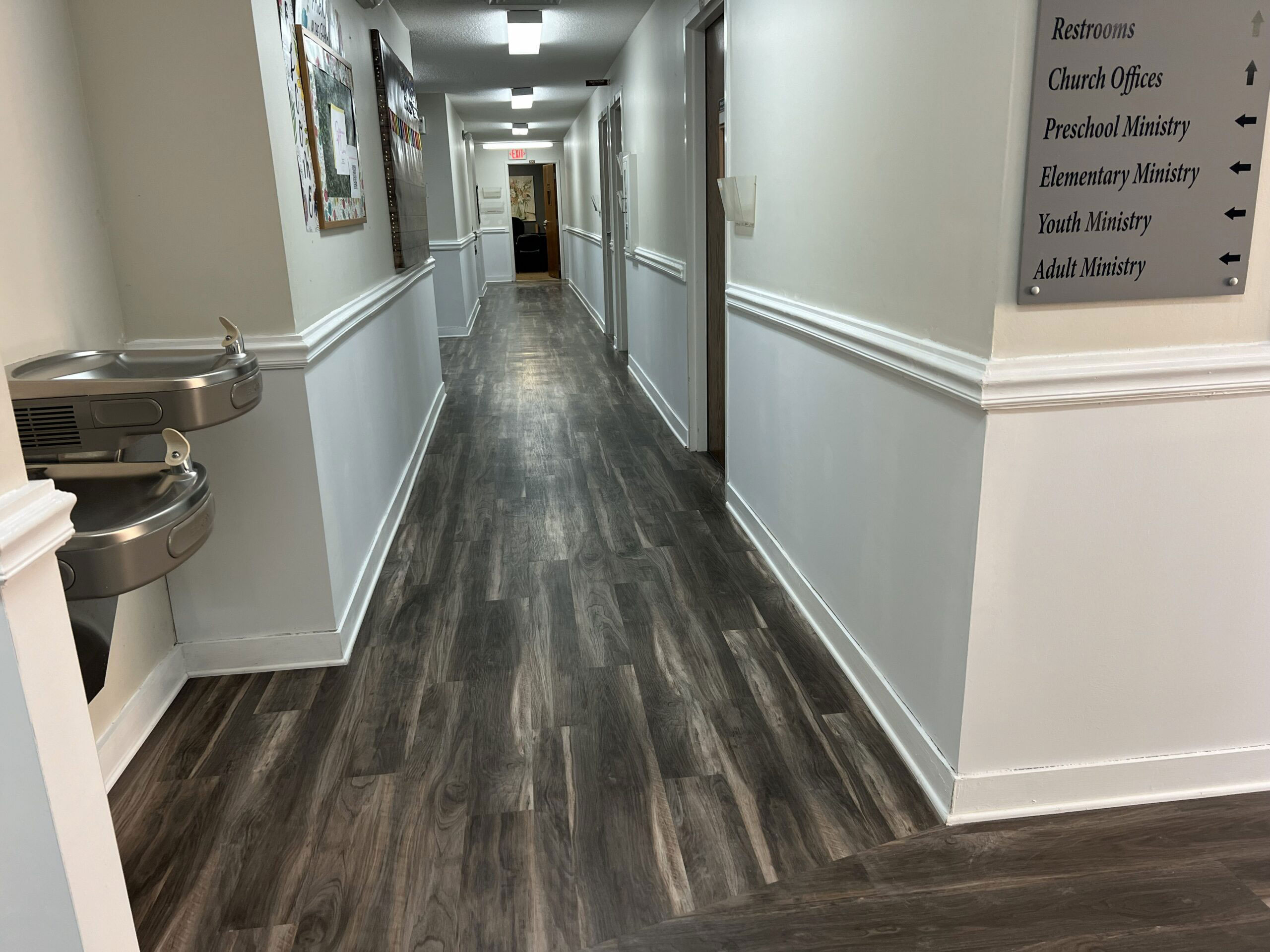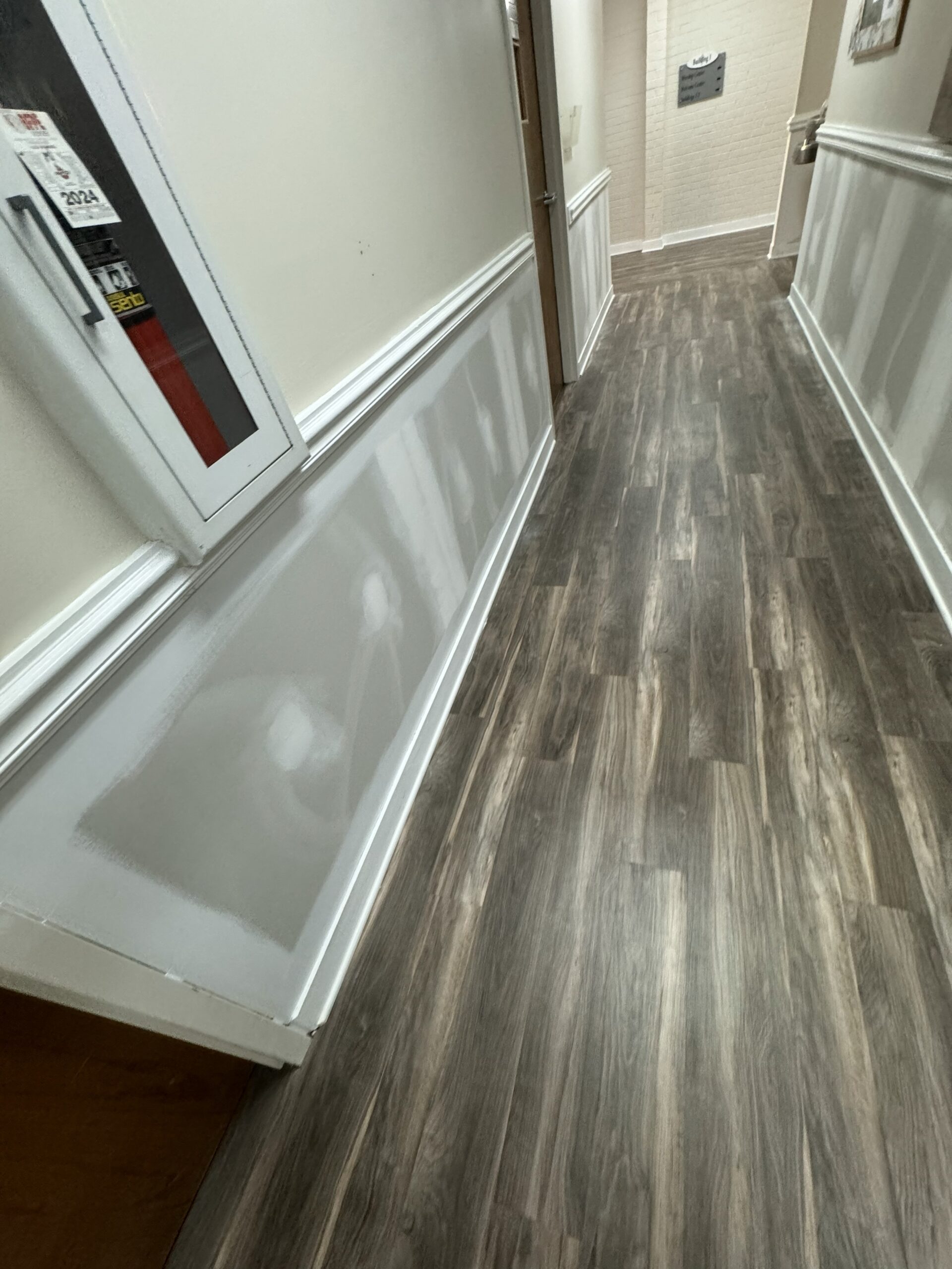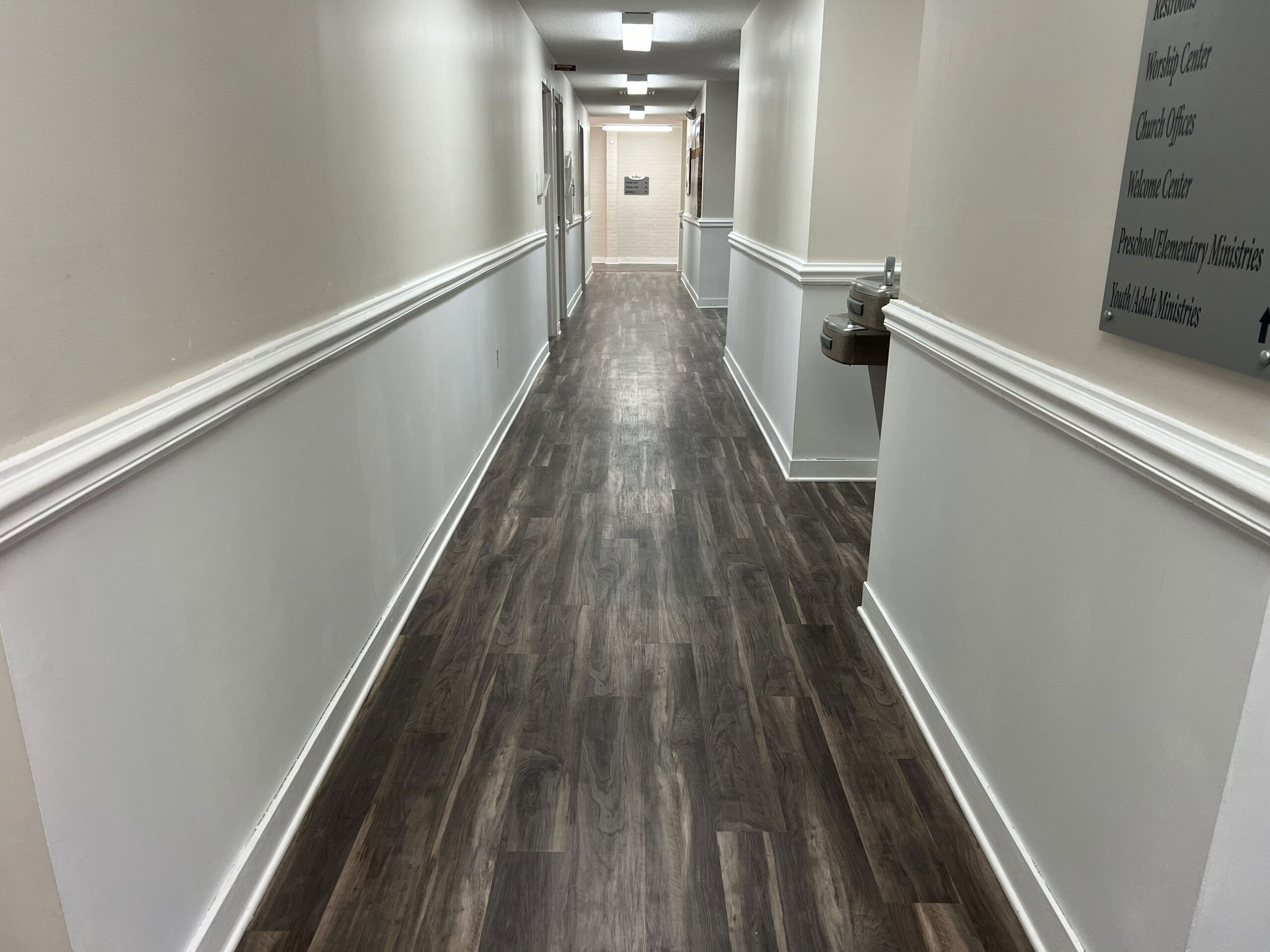 In a recent project at a church in Wake Forest, we were asked to remove wallpaper from the lower portion of the walls throughout the hallways and prepare the surfaces for paint. The walls were divided by chair rail molding, with wallpaper below and painted drywall above, finished with baseboard molding along the floor. The wallpaper had been in place for many years, so we took a careful, step-by-step approach to remove both the paper and the adhesive.